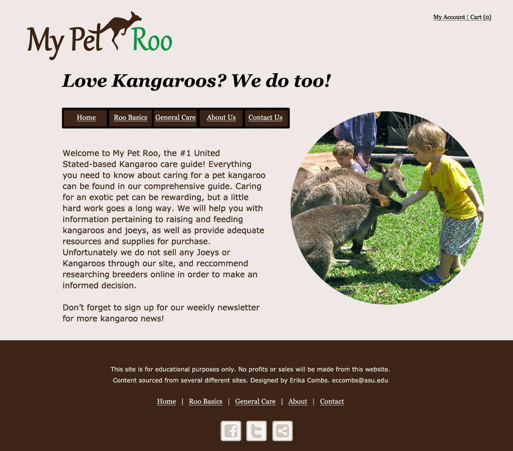 This project was a study in responsive web design and branding/graphic design. When deciding my mock brief for this project I wanted to dive into something unconventional but familiar to me. Growing up, my family briefly cared for a young wallaby born in captivity and I always wondered how my mom found information on what to feed him. The site was intended to be mobile-first, informational, and easy to navigate for users.